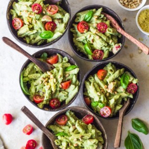 Delicious protein packed vegan pasta with a hummus pesto sauce. Addictive, healthy and easy.