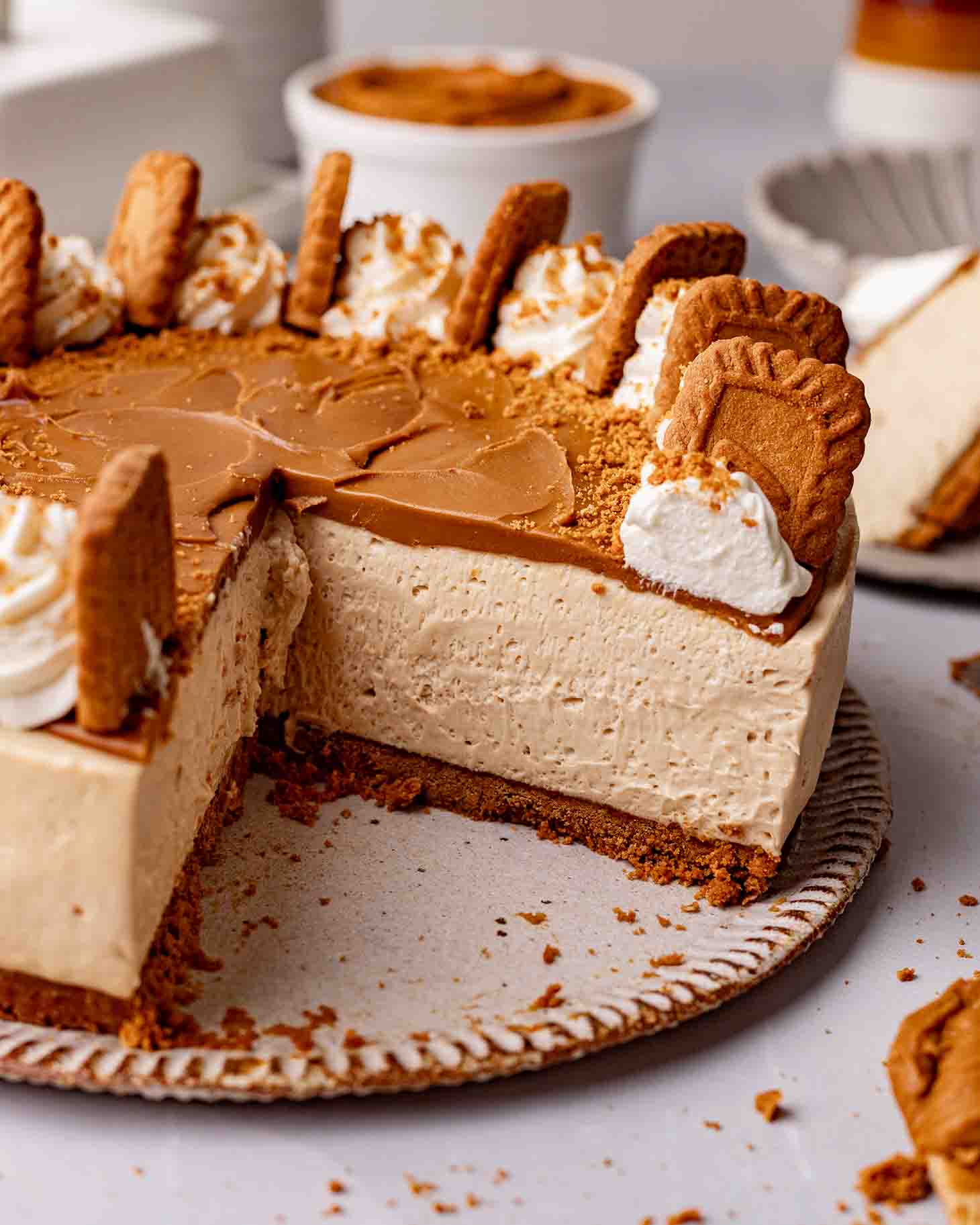 - It’s best to decorate this cheesecake just before serving but if you’re bringing this to an event, the whipped cream and Biscoff cookie decorations are at their best within 2-4 hours. After this time, the cream will begin to deflate and the cookies will soften.